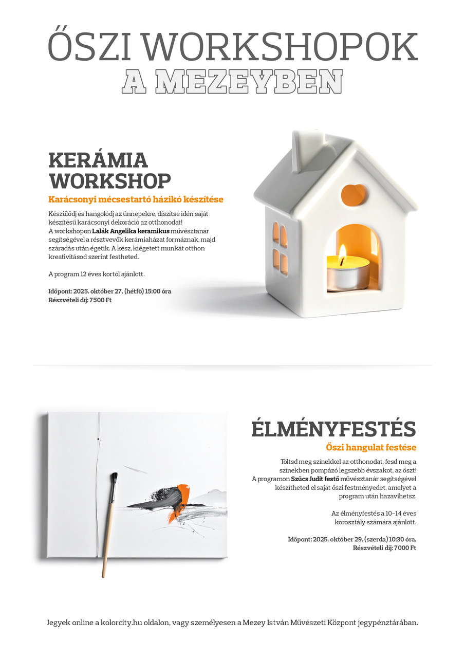 Két őszi workshopnak is helyszínt ad a Mezey István Művészeti Központ októberben. A Kerámia workshop Lalák Angelika keramikus művésztanár vezetésével október 27-én, az Élményfestés workshop pedig Szűcs Judit festő művésztanár vezetésével október 29-én várja a jelentkezőket. Jegyek online ITT érhetőek el.
