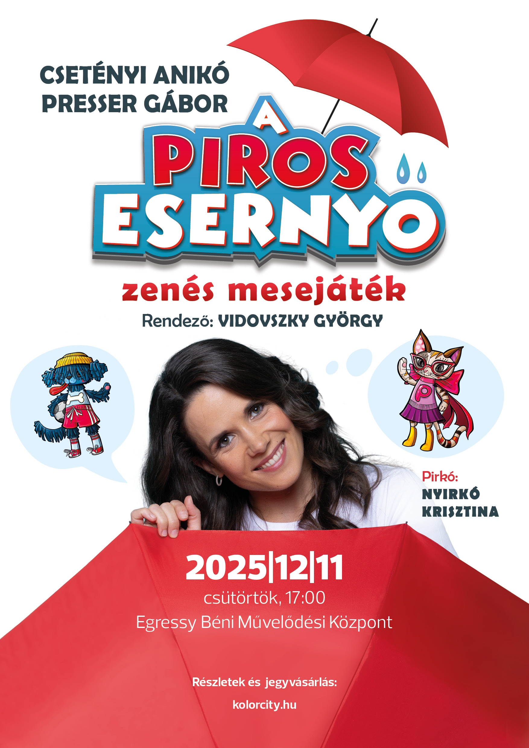 Kazincbarcikán, az Egressy Béni Művelődési Központban is bemutatják Vidovszky György rendezésében Csetényi Anikó és Presser Gábor zenés mesejátékát, A piros esernyő címmel, december 11-én (csütörtökön) 17:00 órától. Jegyek már online is elérhetőek ITT.