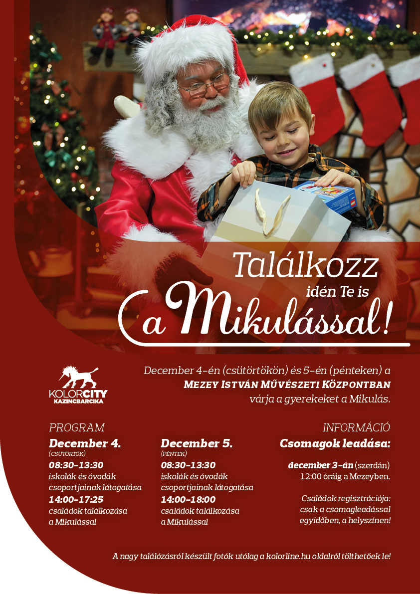 December 4-én (csütörtökön) és 5-én (pénteken) a Mezey István Művészeti Központban várja a gyerekeket a Mikulás. Délelőtt az iskolák és az óvodák, délután pedig a családok találkozhatnak a Nagyszakállúval. Vissza